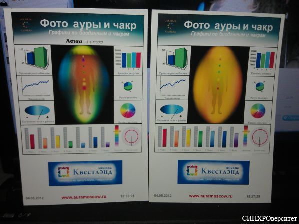 Мы вернулись делать вторую фотографию. Я отошла подальше, чтобы в этот раз не внести искажений в результат. Сделали фотку, а потом пришла ауросомовый консультант, и меня попросили снова потрогать Лёшу. Они поахали над монитором, порадовались, что нам так повезло друг с другом и как меняется Лёшкина аура, когда я к нему прикасаюсь.