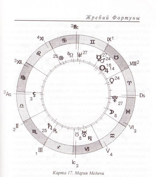 Сразу надо отметить, что сам по себе знак Тельца ярко выражен в данной космограмме, т.к. в нём находится стеллиум из четырёх планет. Значит, качества этого знака будут также ярко выражены и у человека. Стеллиум начинается с Юпитера – с экспансии, со стремления человека показать себя, свой «солнечный принцип» в Тельце. Конечно, само по себе соединение Юпитера и Солнца будет говорить о представительнице знатного рода, с большими традициями пребывания у власти. Далее энергия передается Марсу и Меркурию, которые используются Юпитером и Солнцем для того, чтобы показать себя. Это достаточно конкретный и практичный ум, способность вникать в самую суть вещей (всё это в VIII-ом доме), трансформировать своё окружение и атмосферу, в которой человек находится. Качества Солнца в Тельце проявляются здесь в стремлении навязать свой порядок, привести государство к тому виду и той форме, которая кажется Марии Медичи (ММ) правильной. При этом оценки «правильности» довольно субъективны. Это Творец, довольно жёстко навязывающий свою волю, вплоть до диктаторства – так проявляется устойчивость внутреннего «Я» Тельца, всегда сконцентрированного на достижении цели. Даже если выбранный путь ошибочен, для ММ свернуть с него не представляется возможным – это инертность земли. Одним из способов, которым ММ формировала угодную ей политическую и религиозную ситуацию в стране были династические браки, а также, «фамильная» склонность к устранению врагов при помощи ядов и наёмных убийц – человек склонен к авантюрам довольно сомнительного плана. Взаимодействие с людьми происходит по принципу «подчинение-борьба», что, учитывая её постоянные притязания на высшую власть, порождало восстания и недовольство высшей знати, которую она также пыталась подчинить себе. Потребность в постоянной поддержке окружающих, к которой регентша находила опору, выливалась в то, что Мария Медичи предпочитала править вместе со своими фаворитами, она постоянно их меняла и тратила на них огромные государственные средства. Казна Франции была истощена, что не прибавляло ей ни народной любви, ни уважения дворянства.