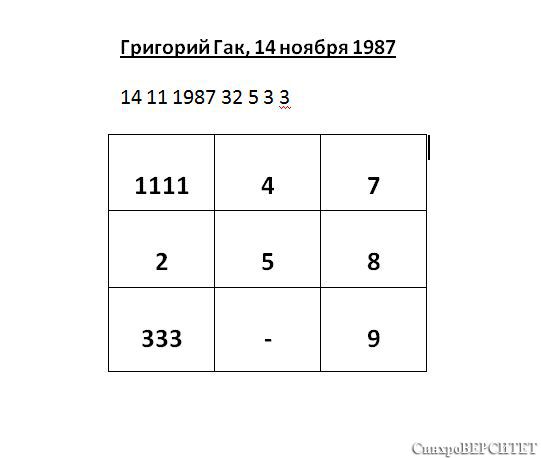 скажем, мой брат: 14 ноября 1987 года 1+4+1+1+1+9+8+7= 32 2. Берете то, что плучилось, и складываете еще раз: 3+2= 5 Иногда это число получается двузначным - так и оставляете, дальше не складываете. 3. Теперь из суммы чисел в дате рождения (32) вычитаете удвоенное первое число в дате рождения (в нашем случае это "1", так как в "14" первая цифра "1"): 32- (2Х1)= 32-2= 30 4. И, наконец, складываете последнее чифры в последнем числе (30): 3+0=3 Иногда это число получается двузначным, например 11, - так и оставляете. 5. Выписываете в ряд, без нулей, дату рождения, результат (1), результат (2), результат (3) и результат (4). В нашем примере получится: 14 11 1987 32 5 3 3 А теперь записываете это дело в квадрат, единицы к единицам, двойки к двойкам, тройки к тройкам и так далее. *Удобнее записывать цифры по почердеи в отведенный для них квадрат, а не считать, сколько единиц, двоек, и так далее. Если каких-то цифр у человека нет вовсе, то ставите там прочерк или пишете "нет". Вот что у нас получится: ![]() Если есть вопросы по расчетам, пишите в комментарии :) Следующим постом я вывешу лекцию о том, что с этим квадратом делать. |